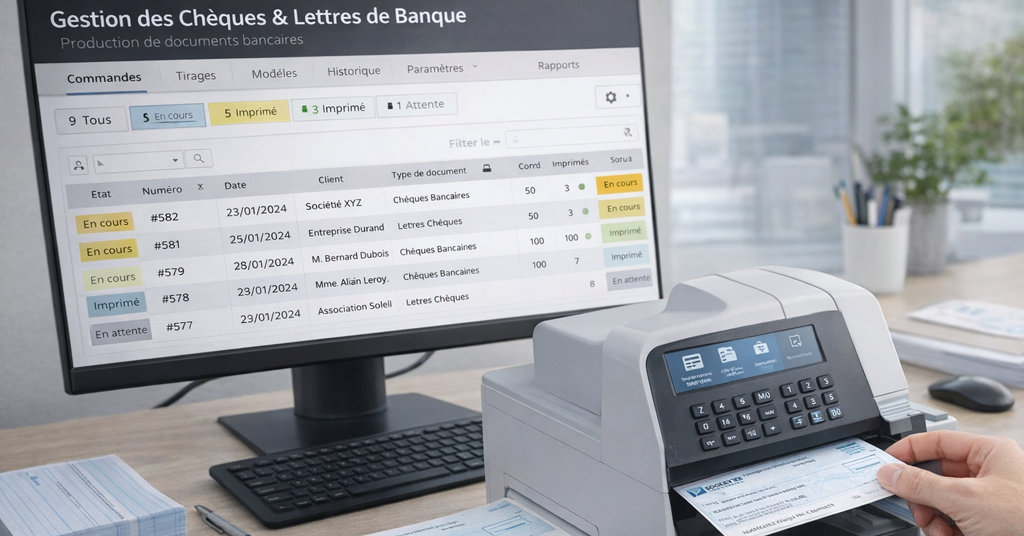 Solution informatique avancée dédiée à la gestion complète du cycle de production des chèques et lettres chèques bancaires.